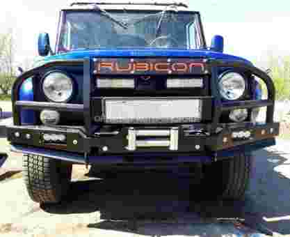 С площадкой под лебёдку, с пазами под реечный домкрат, вырезами под ПТФ.