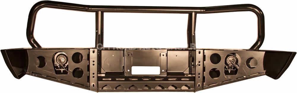 Передний силовой бампер с защитной дугой служит для защиты автомобиля на бездорожье и в городе. В случае контакта или легкого столкновения с препятствием в виде камней, бревен, пней, колей или незадачливых водителей, риск получить серьезные повреждения машины существенно уменьшается, а это очень важно в экспедициях и в повседневной жизни. Бампер с кенгурятником не только защитит, но и украсит внедорожник благодаря эффектному и элегантному дизайну.