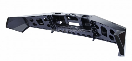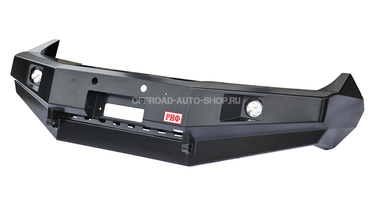 В данный бампер интегрирована площадка для лебедки. Оптимальной является лебедка с тяговым усилием 4100-4300 кг. Но бампер позволяет установить и более мощную лебедку с тяговым усилием 5400 кг. Также возможна установка переходника под лебедку. Бампер оснащен мощными упорами под реечный домкрат и буксирными проушинами для работы с рывковой или буксировочной стропой. Тщательно продуманная конструкция внутренних усилителей обеспечивают максимальную надежность бампера, стойкость к высоким нагрузкам и сильным ударам. Бампер штатно комплектуется мощными и экономичными светодиодными фарами водительского света , модель SM-810F. Они формируют плотный пучок дополнительного света, который рассеивается перед автомобилем. Эти фары хорошо освещают дорогу и обочины, обеспечивая более широкую видимость по сторонам. Являют собой неплохое дополнение ближнего света.