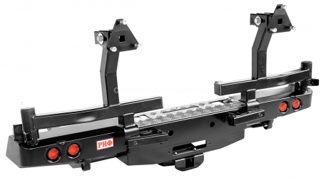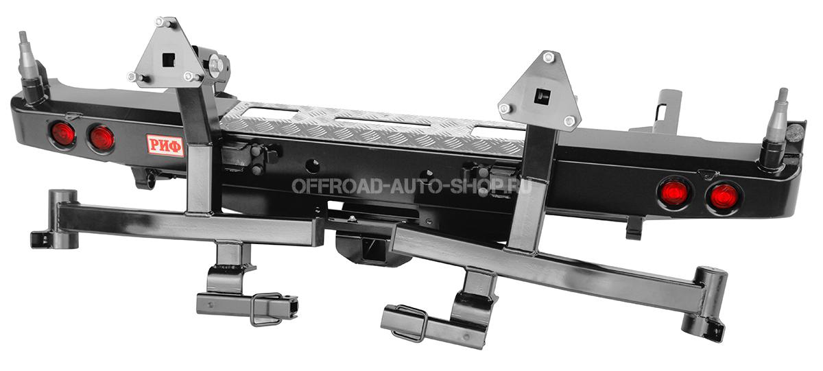 Встроенный американский квадрат позволяет использовать любые съемные фаркопы, переходники, буксировочные устройства или съемные площадки для лебедки. Надежная калитка выдержит самое большое запасное колесо. Надежный фиксатор калитки удержит ее в закрытом состоянии на любой пересеченной местности, особо жесткая конструкция калитки рассчитана на тяжелую запаску большого размера.