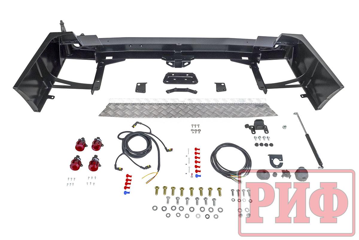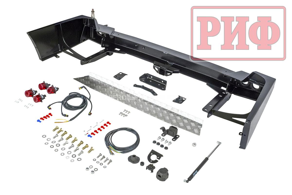 Встроенный американский 'квадрат' позволяет использовать любые съемные фаркопы, переходники, буксировочные устройства или съемные площадки для лебедки. Надежная калитка выдержит самое большое запасное колесо. Надежный фиксатор калитки удержит ее в закрытом состоянии на любой пересеченной местности, особо жесткая конструкция калитки рассчитана на тяжелую запаску большого размера.