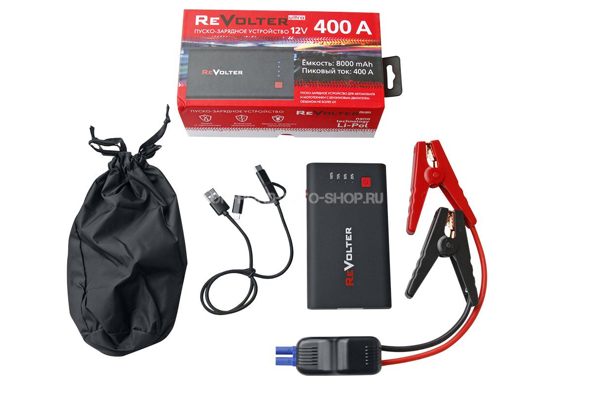 Назначение. Для пуска бензинового двигателя объёмом до 4 литров. До 15 пусков на одном заряде. В зимний период запуск бензинового двигателя объёмом до 2 л., дизельного двигателя до 1,5л. Для зарядки смартфонов, планшетов, ноутбуов и прочих электронных устройств. Полная зарядка телефона от 3-х до 6-х раз. В комплект с устройством идут провода, благодаря которым ток в 400А подается на клеммы штатного аккумулятора, а затем на стартер. Для того чтобы защитить вас, ваш автомобиль и ваше пуско-зарядное устройство, в комплекте с Revolter Ultra поставляются интеллектуальные провода с пятью степенями защиты: 1- Защита от переплюсовки; 2- Защита от короткого замыкания; 3- Защитой от перезаряда ПЗУ; 4- Защитой от противотока; 5- Сигнализация о неисправности штатной АКБ или отсутствие надежного контакта.