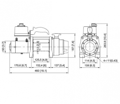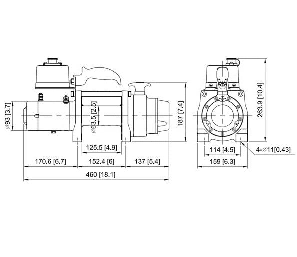 Характеристики: Артикул: 854752 Тяговое усилие: 2722 кг Мотор: 2390 Вт / 3.2 лс, 12В Редуктор: 3-х ступенчатый планетарный Передаточное число: 216 : 1 Тормоз снаружи барабана: Автоматический, конический СBS. Размер троса мм x м: 8 ? 24,4 м Тип троса: синтетический SK-75 Dyneema 12-ти прядный Размер барабана мм x мм: 63.5 x 125,5 Монтажный шаблон мм x мм: 152,4 x 114
