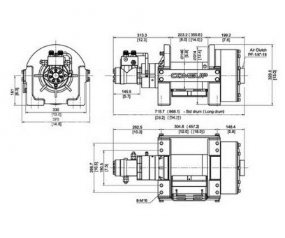 Спецификация: Артикул: 682030 с барабаном стандартной длины Линейное усилие: 9070 кг для 1 слоя троса Рабочее давление: 175 Бар Прокачка масла: 60 л / мин 15.9 г / мин Мотор: 155,7 см3/ об. Редуктор: двухступенчатый планетарный Передаточное число: 30 : 1 Конструкция лебедки: стальная со стальным барабаном Вращение лебедки: трос должен заходить в барабан снизу Сцепление свободный ход барабана: отключаемый главный вал Тормоз: мультидисковый MDB Трос : 14 мм х 43 м 1960 Н / мм 2 разрывное усилие в 137 кН для SAE J706 16 мм х 30 м 1960 Н / мм 2 прочность на разрыв 179 кН для EN 14492-1 Размер барабана вн диа. мм x нар. диа мм х расст. между мм: 146 x 314 х 203 Монтажный шаблон мм x мм: 190,5 х 304,8 мм, 266,7 х 304,8 мм