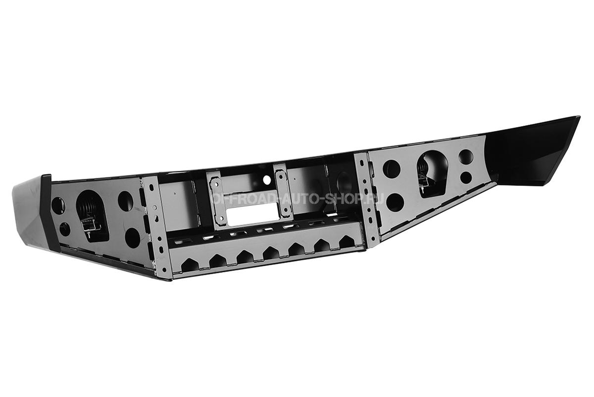 Бампер оснащен мощными упорами под реечный домкрат и буксирными проушинами для работы с рывковой или буксировочной стропой. Тщательно продуманная конструкция внутренних усилителей обеспечивают максимальную надежность бампера, стойкость к высоким нагрузкам и сильным ударам.