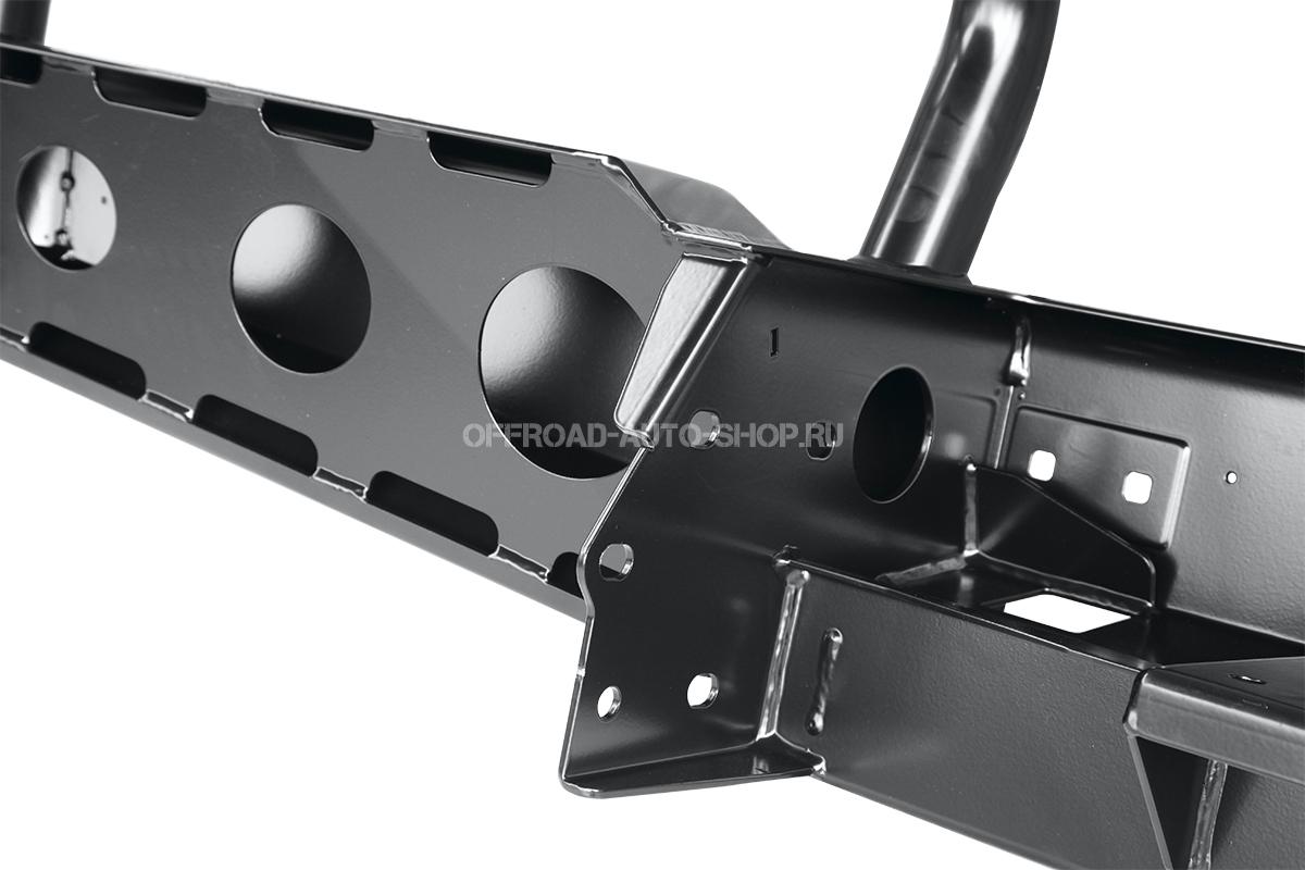 Бампер оснащен интегрированной площадкой для лебедки и оборудован мощными упорами под реечный домкрат, а также буксирными проушинами для работы с рывковым тросом или буксировочной стропой.