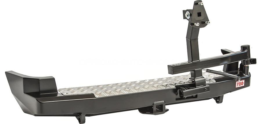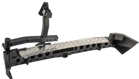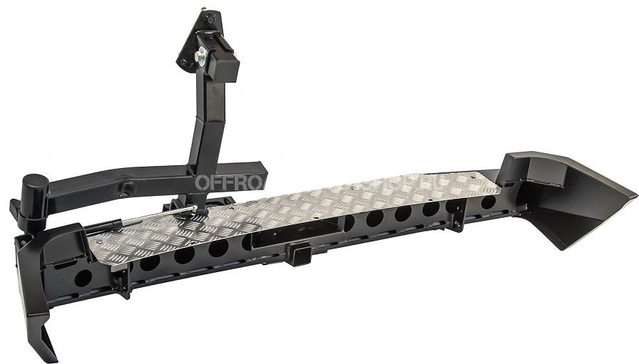 В нижней части бампера располагается интегрированный в корпус «квадрат» стандарта 2”, который может использоваться для крепления фаркопа, площадки-ступеньки, буксировочной проушины, площадки под переносную лебедку и пр. Предусмотрены две мощные буксировочные проушины и вырезы для размещения дублирующих сигнальных фонарей основные могут перекрываться запасными колесами большого диаметра.