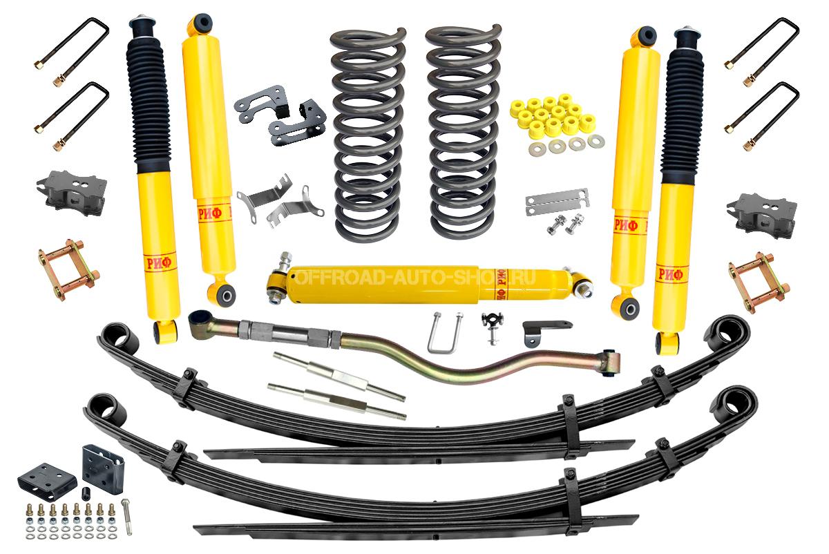 Все компоненты лифт-комплектов разработаны специально для эксплуатации внедорожника в тяжелых условиях на различных дорожных покрытиях. Рессоры, амортизаторы с технологией R-AIR и пружины не только компенсируют вес установленного на внедорожнике дополнительного оборудования (бамперов, порогов, дополнительных топливных баков, лебедок и прочего), но также существенно повышают грузоподъемность автомобиля. Удлиненные стремянки и серьги произведены из высококачественных материалов и имеют увеличенный запас прочности. Рессорные втулки изготовлены из полиуретана обладает высокой упругостью, износостойкостью и термоустойчивостью к высоким или низким температурам.