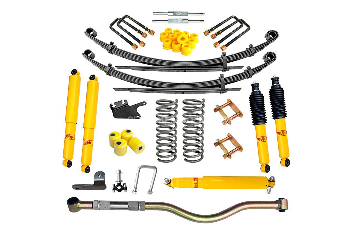 Все компоненты лифт-комплектов разработаны специально для эксплуатации внедорожника в тяжелых условиях на различных дорожных покрытиях. Рессоры, амортизаторы с технологией Foam Cell и пружины не только компенсируют вес установленного на внедорожнике дополнительного оборудования (бамперов, порогов, дополнительных топливных баков, лебедок и прочего), но также существенно повышают грузоподъемность автомобиля. Удлиненные стремянки и серьги произведены из высококачественных материалов и имеют увеличенный запас прочности. Рессорные втулки изготовлены из полиуретана обладает высокой упругостью, износостойкостью и термоустойчивостью к высоким или низким температурам.
