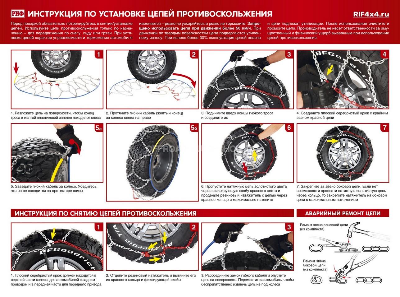 Перед началом эксплуатации цепей противоскольжения определите возможность их установки на ваше транспортное средство. После приобретения, перед поездкой обязательно потренируйтесь в снятии/установке цепей для получения необходимых навыков.