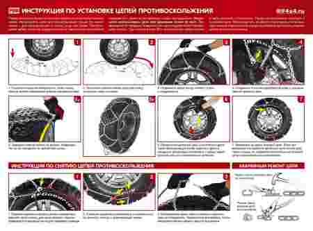 Цепи противоскольжения устанавливаются только по-парно на ведущие колеса одной оси транспортного средства, установка одной цепи на одно колесо оси недопустима. В комплекте 2 шт. для установки на ведущие колеса одной оси !